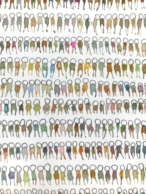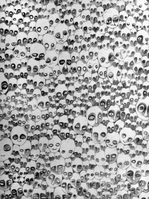 The mechanical and repetitious process engaged in drawings is used to express quantity within one and all. Each portrait is just a number of things/marks with which it was created. However, at the end it becomes and exists only as a part of the whole (number as a part of the larger number). Perhaps humanity functions this way as well.